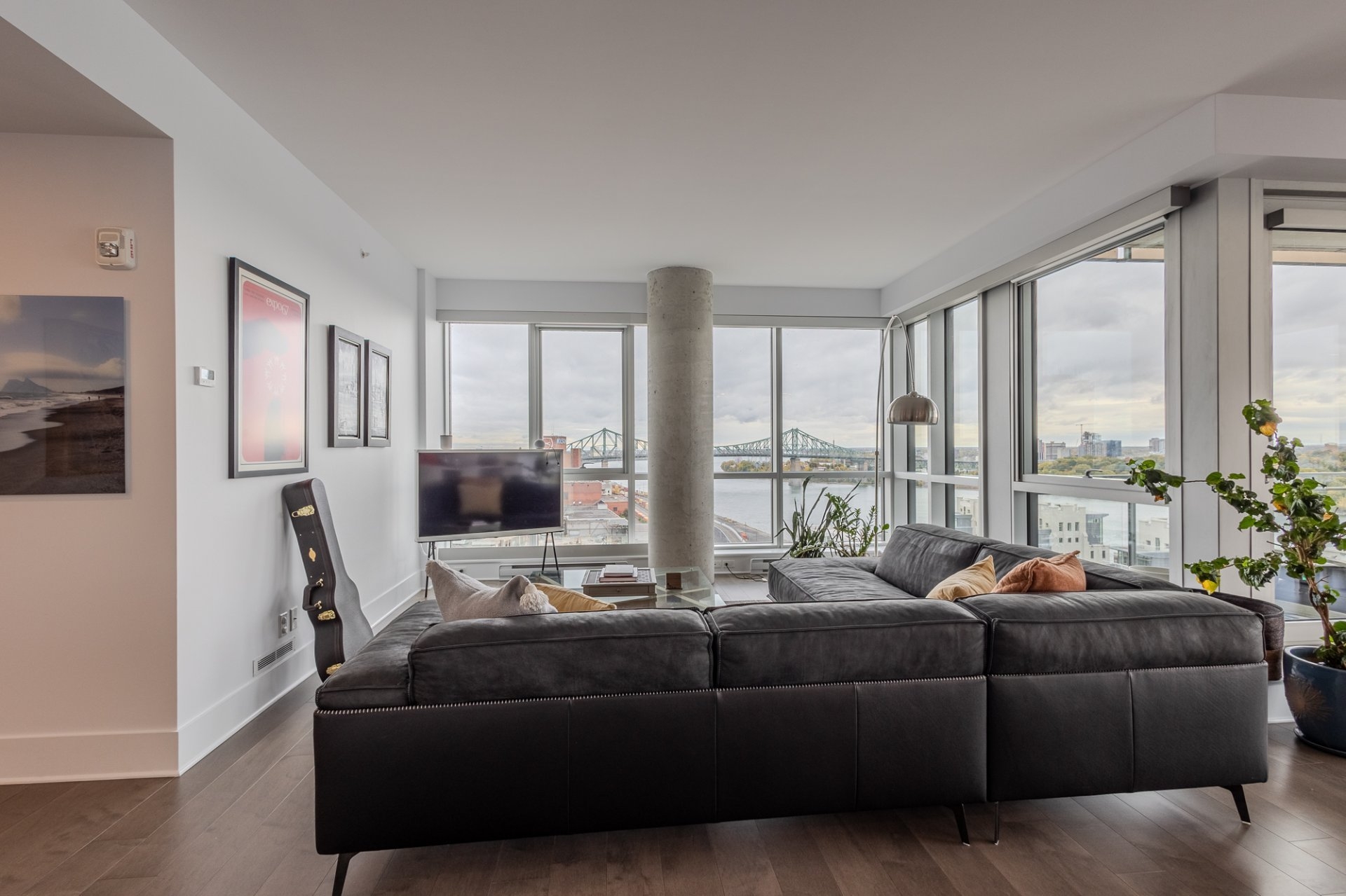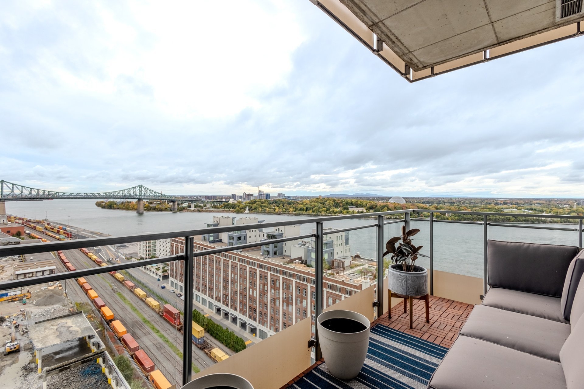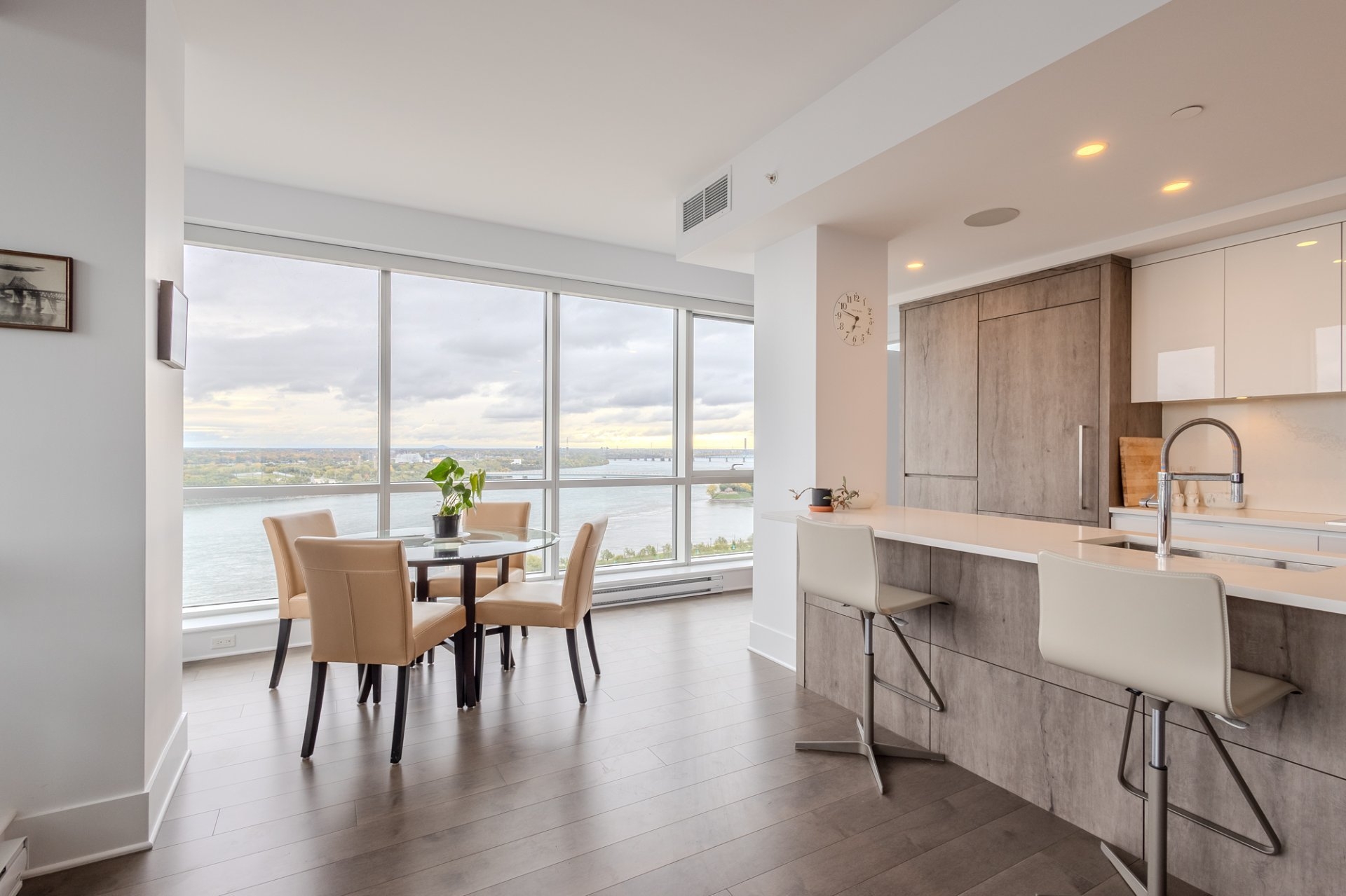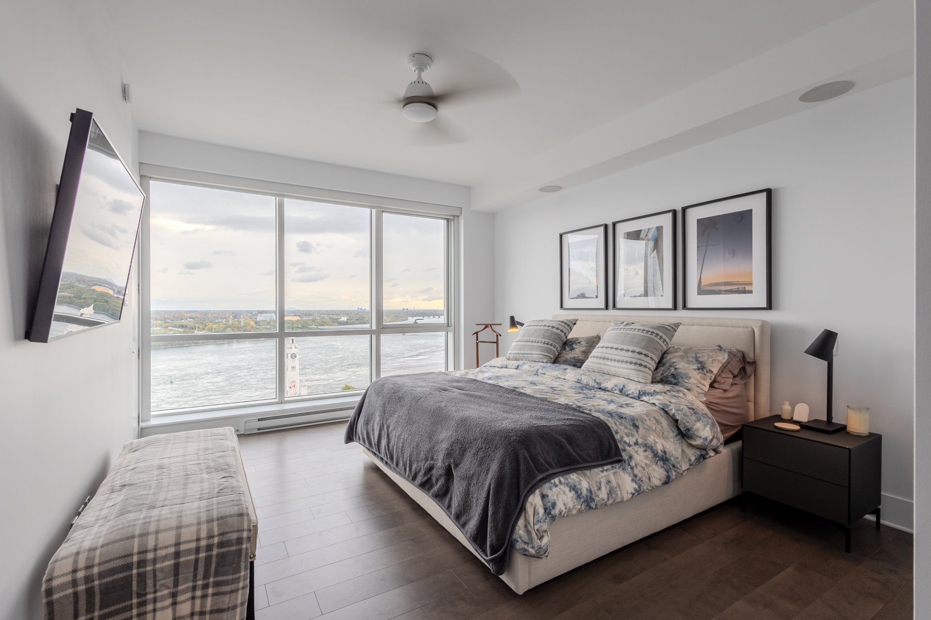 Welcome to the Suite 1701! This luxurious cornor unit is located on the 17th floor, offering 1622 square feet of luxurious living space. The unit features 3 bedrooms and 2 bathrooms, making it ideal for both families and individuals seeking premium living. Fully Furnished: This unit is being rented fully furnished, equipped with high-end appliances and exquisite furniture, providing a seamless move-in experience for the future tenant. Stunning Views: The unit boasts an unobstructed 180-degree view of the St-Laurent River and overlooks the iconic Quai de l'horloge in the Old Port of Montreal. The astonishing view can be enjoyed all day, creating an exceptional living environment. Natural Light: As a corner unit, it enjoys exceptional natural light throughout the day, providing a bright and airy ambiance in every room. Master Suite: The master bedroom features a spacious walk-in closet and a private ensuite bathroom for comfort and convenience. Prime Location: Situated in a peaceful area of the Old Port, the condo offers tranquility while being just a short walk from the lively center of the Old Port, with easy access to restaurants, shops, and entertainment. Parking and Storage: The condo includes one parking spot with an electric vehicle charging station, as well as a storage room in the second basement. There is potential to acquire a second parking spot if needed. Building Amenities: The building offers a range of luxurious amenities, including: Outdoor pool with an urban chalet located on the 8th floor. Indoor pool. Sauna. Spa. Yoga room. Fully equipped gym. Additional Features: The open-concept design enhances the spaciousness of the living areas, making it ideal for entertaining or relaxing. High-end finishes throughout the unit add to the overall luxury and sophistication. Control4 Home Automation Controls all music types including Spotify, apple and Amazon music Speakers in kitchen, livingroom , master bedroom and bathroom ,bass in living room Controls all blinds in condo. master bedroom, living room , dinnette area, office and spare bedroom Controls all lights in the condo, except inside closets Controls all heating and air conditioning in condo One app controls everything, even over the internet